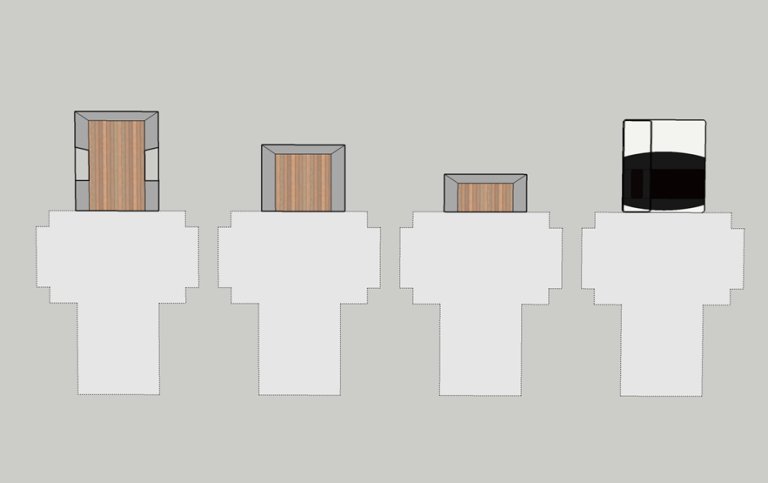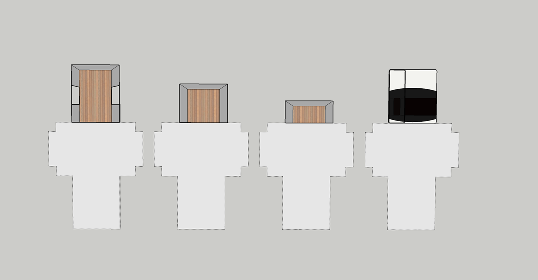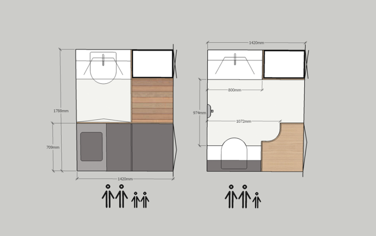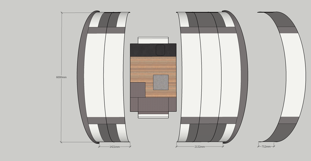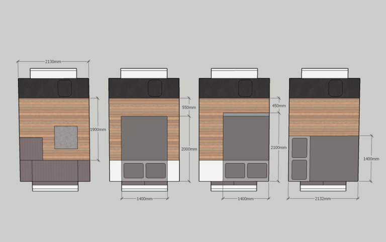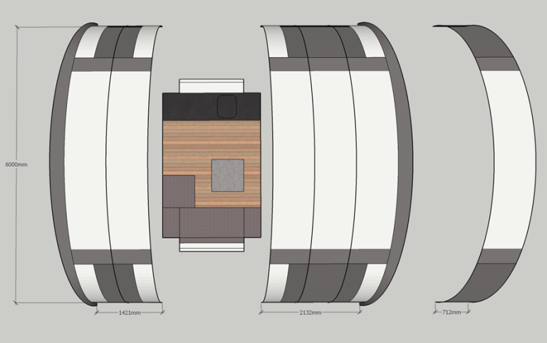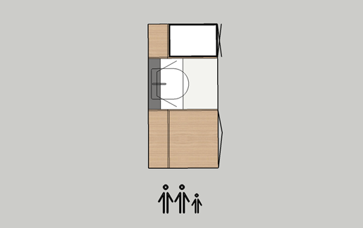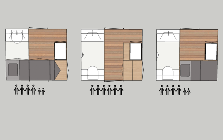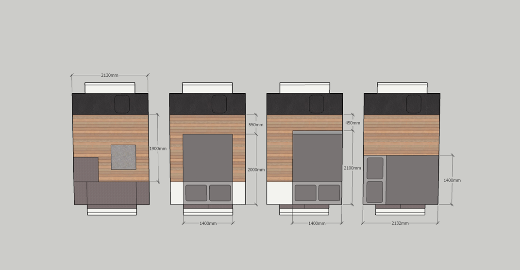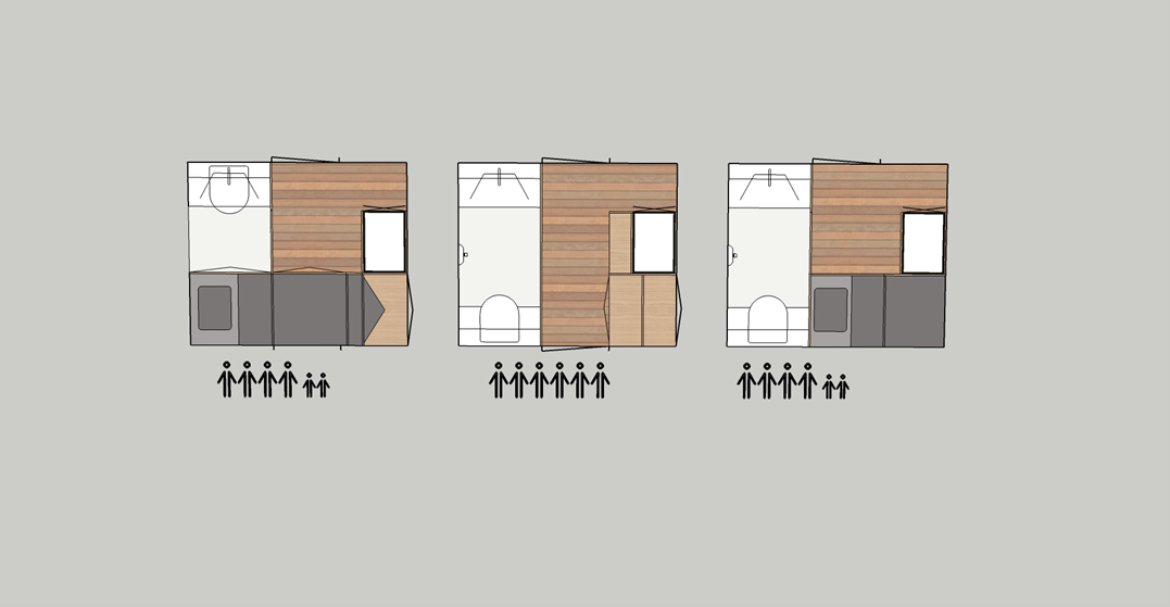 Een slide-out is een doosvormig volume dat tijdens het rijden in de trailer zit en op locatie de leefruimte van MORV aanzienlijk vergroot. Slide-out L is het grootste volume en biedt, naast de afgebeelde indelingsmogelijkheden, de meeste flexibiliteit. Deze uitvoering maakt kamperen met 6 of meer personen mogelijk. In de zijwanden van deze ‘doos’ bevinden zich aan één of beide zijden deuren die directe toegang geven tot de achtertent.