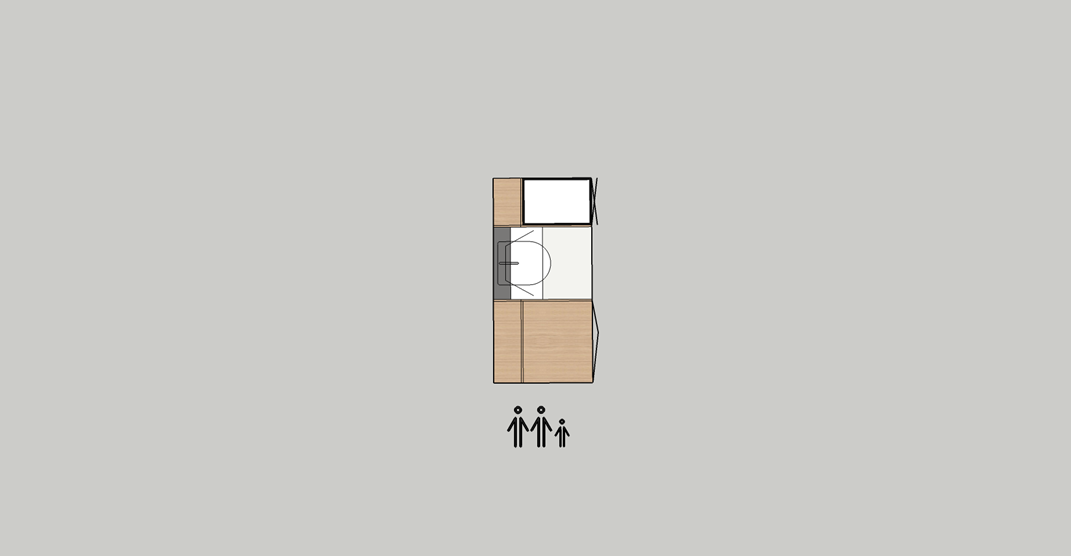 In de basisuitvoering van de trailer zijn diverse opties standaard toepasbaar. De loungebank heeft een vaste opstelling, maar dankzij de mobiele hocker en tafel kun je de loungeruimte flexibel inrichten. In de bank bevindt zich een comfortabele uitklapbare slaapbank. Standaard ontstaat in het midden een queensize bed van 210 × 140 cm. Met een eenvoudige handeling kun je het bed ook naar één zijde verschuiven. Liever een dwarsbed? Ook dat behoort tot de mogelijkheden.